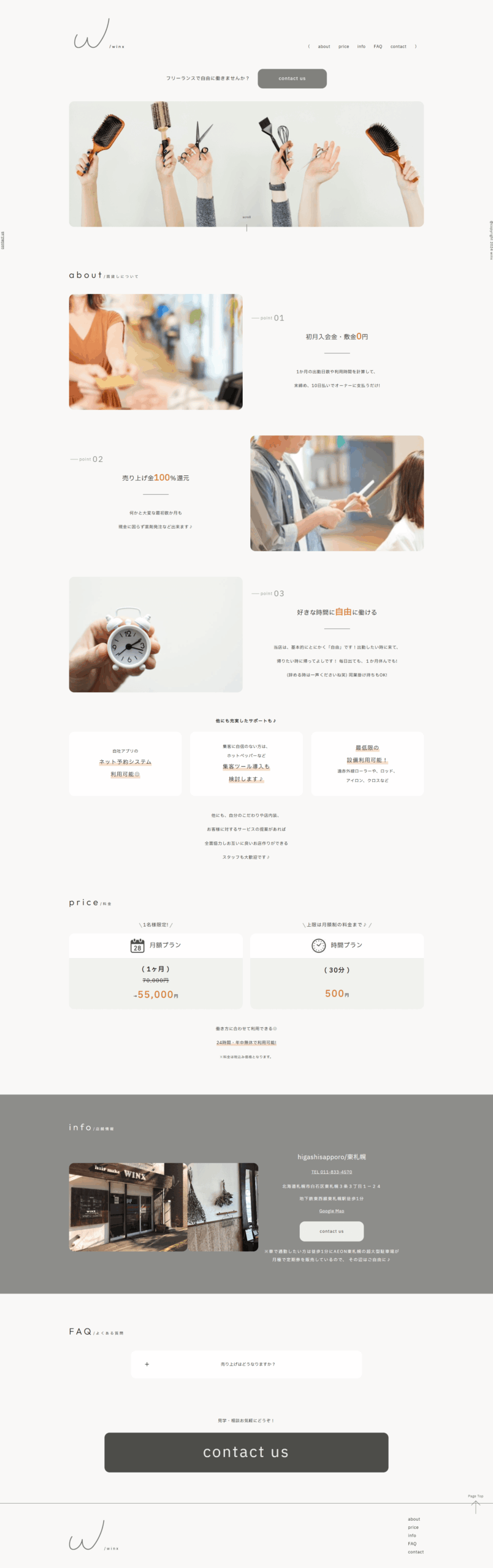 - 父が経営する美容室のサービス「ミラーレンタル(面貸し)」の認知拡大と、興味を持った美容師からの問い合わせ獲得を目的に制作しました。